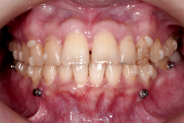 この症例のポイントとして、患者さまは長年、前歯が出ていることや隙間があることを気にされていました。ワイヤー矯正でもインビザラインでも構わないので、しっかり治療したいというご希望がありましたが、通院間隔をできるだけ延ばしたいという点から、今回はインビザラインによる矯正治療を選択しています。