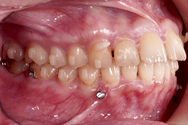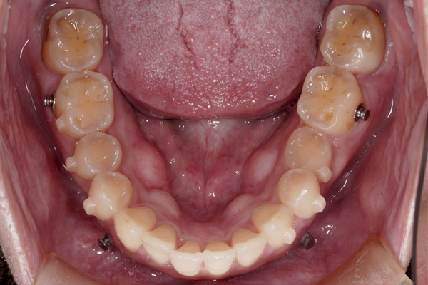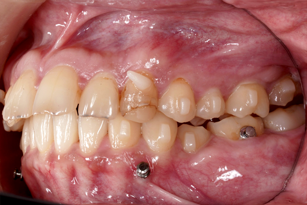 本治療では、インビザラインを用いた非抜歯矯正を行っています。治療の進行にあわせて、インプラントアンカーを使用し、歯を後方へ移動させる計画です。治療期間はおよそ1年6か月を予定しており、現在は開始から9か月が経過した段階です。